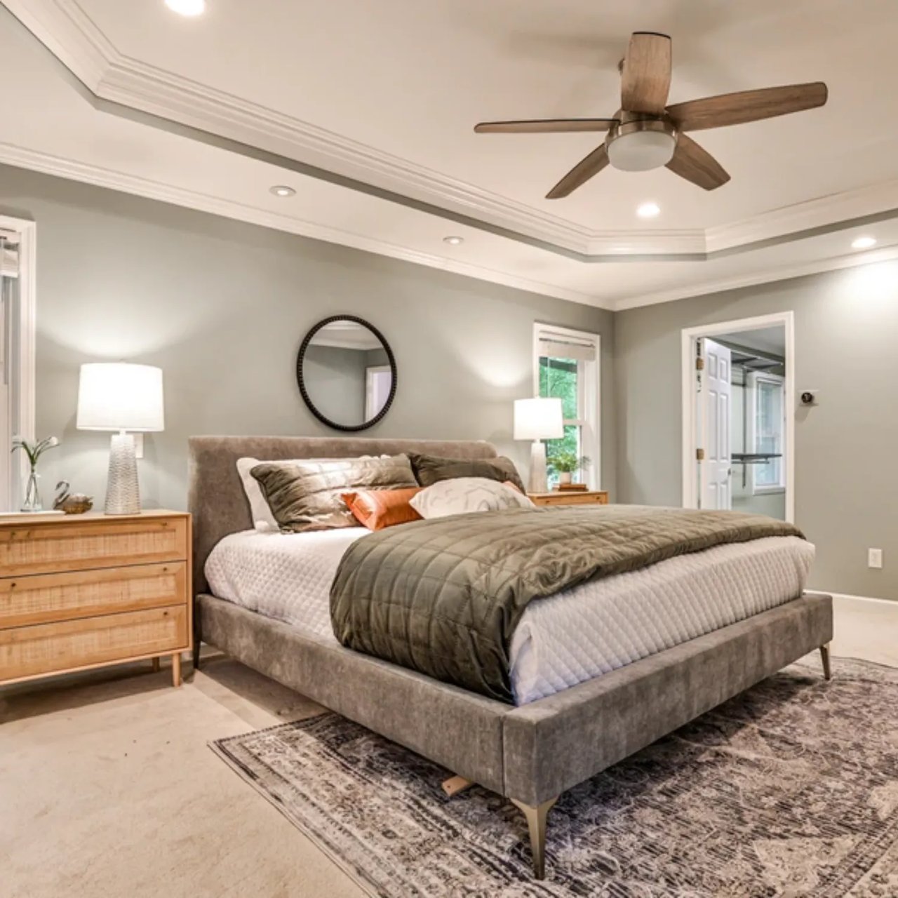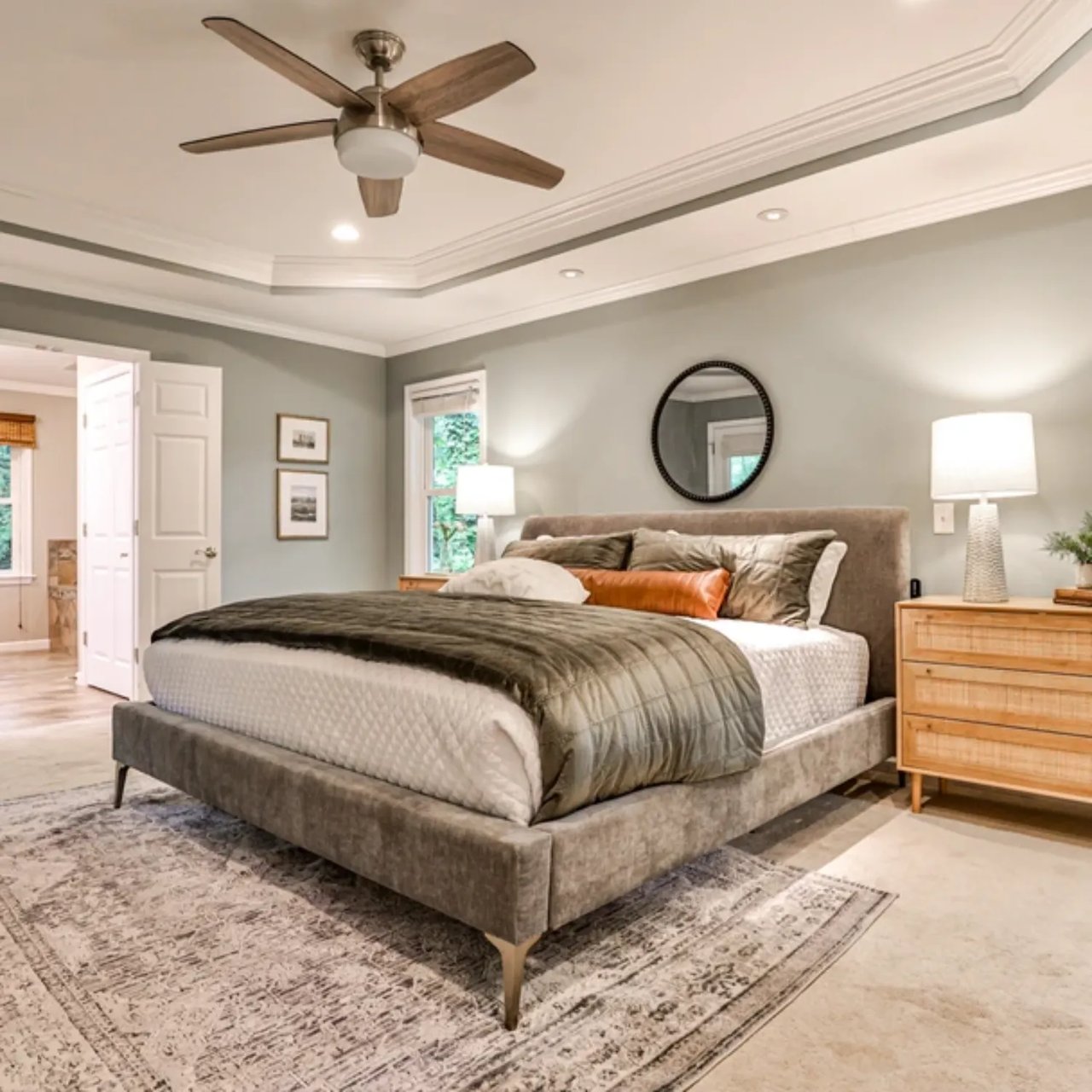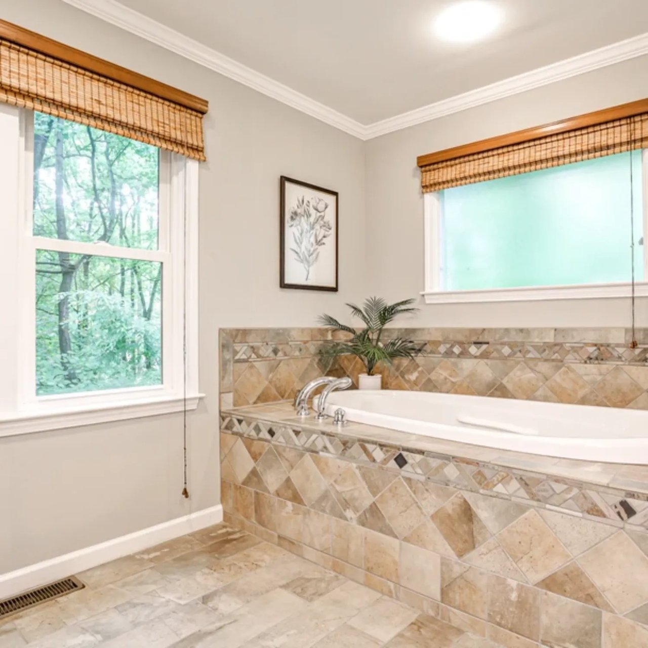 The primary suite offers peaceful views of the backyard, coffered ceilings, and an ensuite bath with a double vanity, jetted tub, walk-in shower, and a spacious walk-in closet. Two additional bedrooms and bathrooms on the main level provide versatility for guest rooms, home offices, or future expansion.